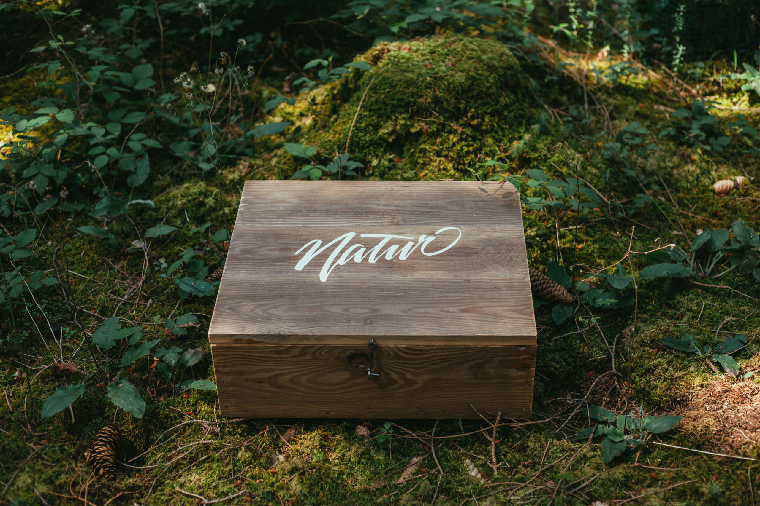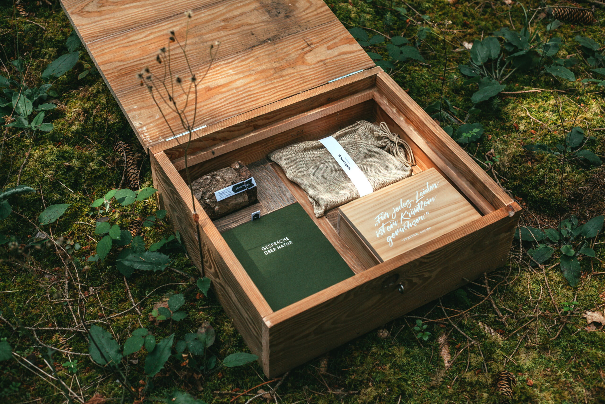 Eine Kiste aus naturbelassenen Holz, in der sich 5 Projekte zum Thema “Natur” befinden: