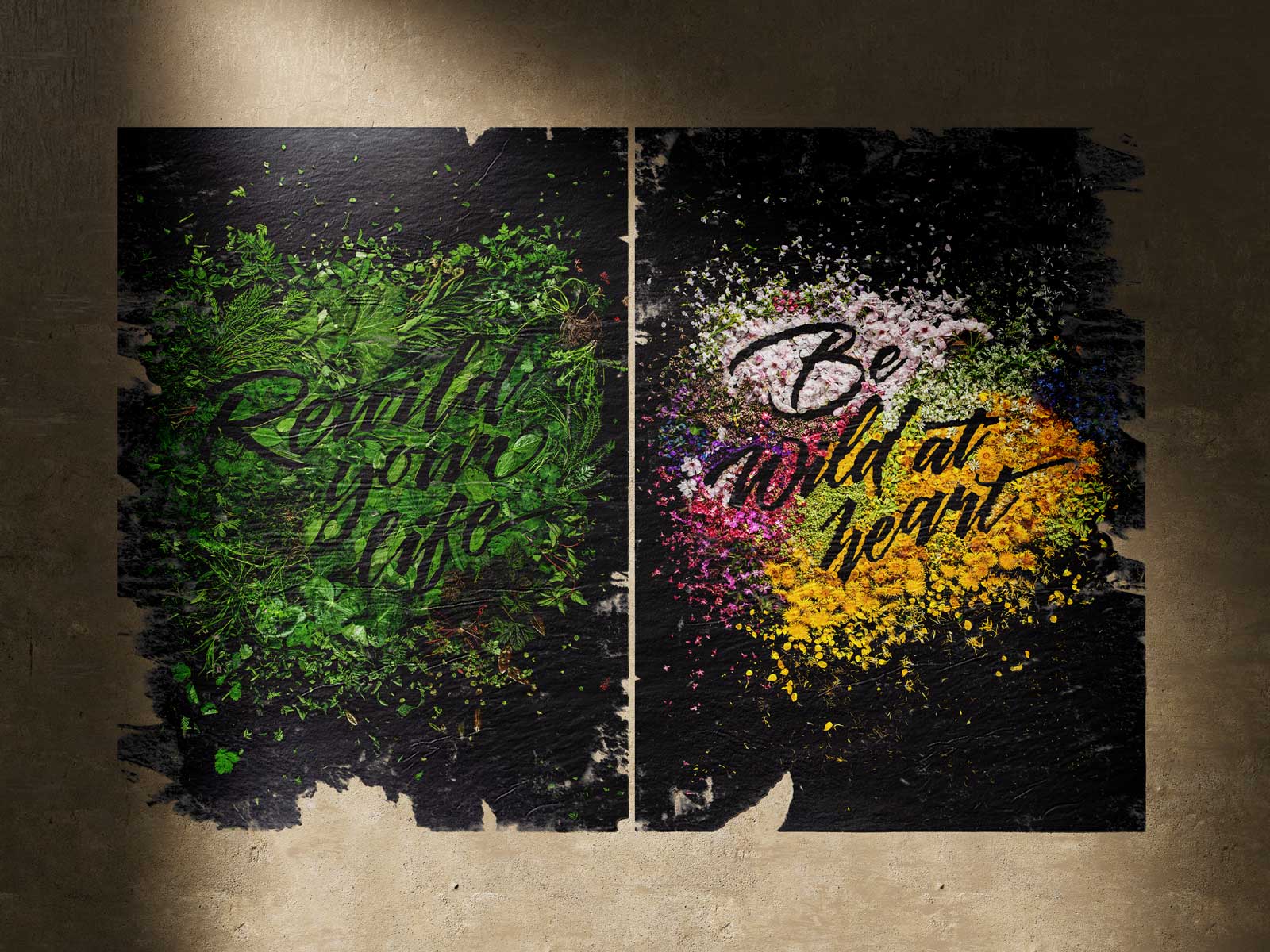 Be wild / Plakatserie: 3 Zitate, mit Bezug auf die Natur, die als Collage aus Naturgegenständen angefertigt wurden. Ohne Bildbearbeitung in mühevoller Arbeit gelegt, fotografiert und als Plakate gedruckt.