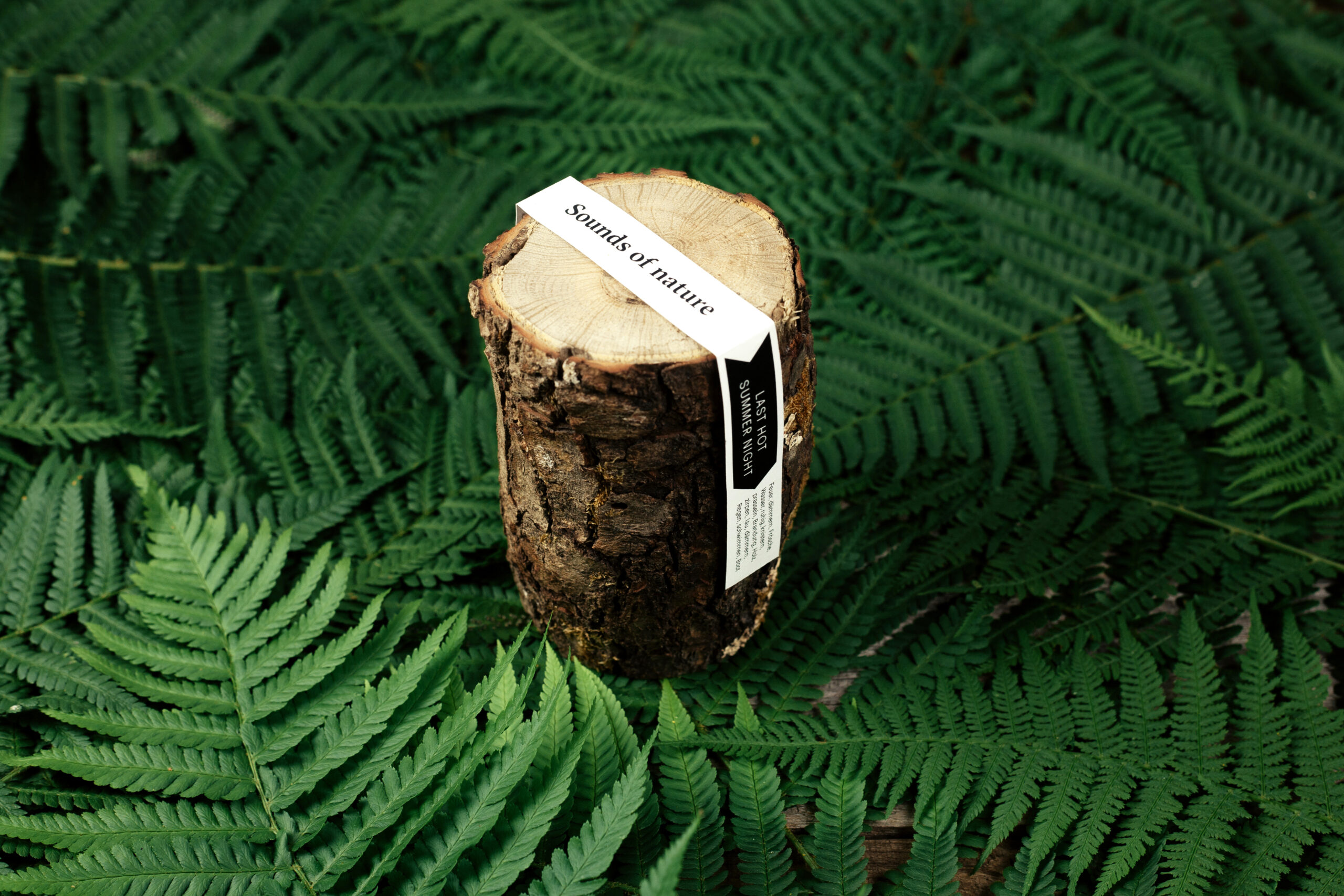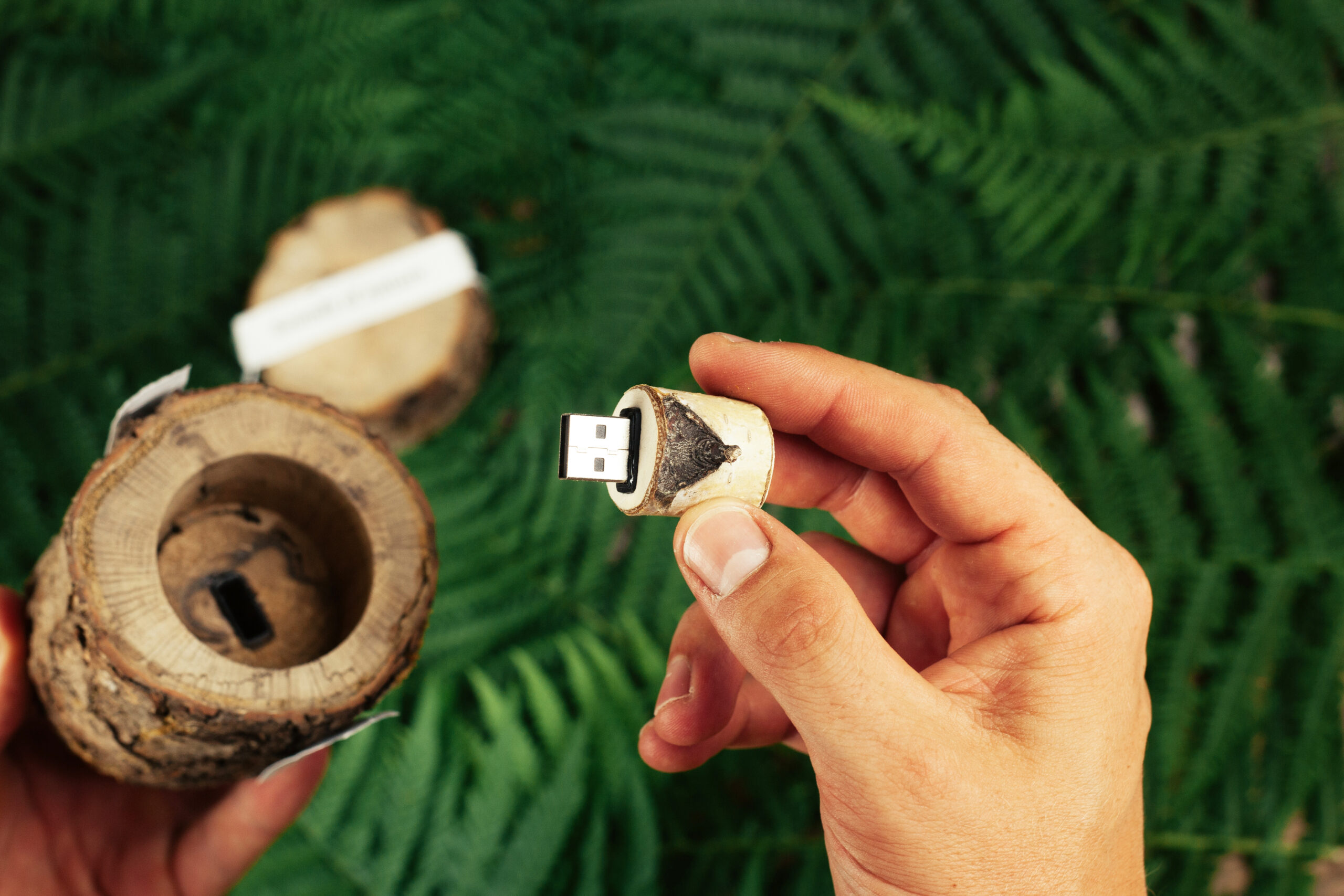Sounds of Nature: 2 Soundfiles (Last Hot Summer Night & Forest Walk). Die Daten befinden sich auf einem USB Stick, der in einen Ast eingearbeitet ist.